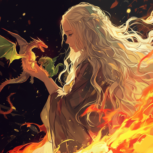 Daenerys, stepping into the flames with dragon eggs, ready to join Drogo in death, discovers magic as the eggs hatch into three tiny dragons, in vibrant anime style. Her long, silver-gold hair and determined gaze shine against the inferno, unharmed. The newly hatched dragons, green, red, and cream, exude playful curiosity amidst the fire, encapsulating rebirth and strength. This scene captures the essence of magic, hope, and maternal power, rendered with dynamic lines and exaggerated expressions typical of anime. --style raw --niji 6