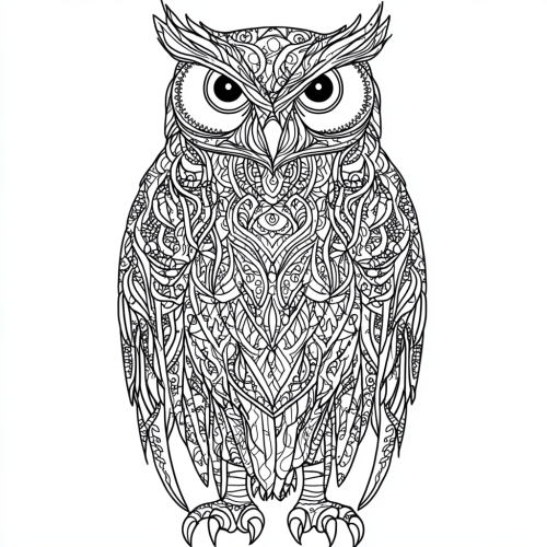Intricate black and white line art of a majestic owl with detailed feathers, in a zentangle style, symmetrical, high detail, monochrome, inspired by Celtic patterns --no shadow