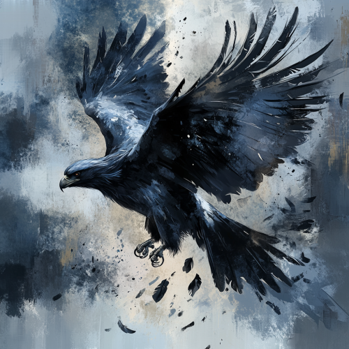 A stealthy, majestic bird in flight, such as an eagle or phoenix, designed with a spray paint aesthetic and optimized for DTG printing. The bird should feature a dark color palette with deep blues, blacks, and subtle metallic accents. The spray paint effect should include rough edges, gritty texture, and dynamic splatters, creating a sense of movement and mystery. The falling feathers should blend with the background, incorporating urban camouflage patterns. The overall design should maintain high contrast and clean lines, suitable for high-quality fabric printing with a sleek and stealthy appearance.