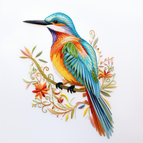 do an embrodiery image of a beautiful bird with it sfeathers half open side view in multicolour with white background and small leaves falling around in a repeated pattern