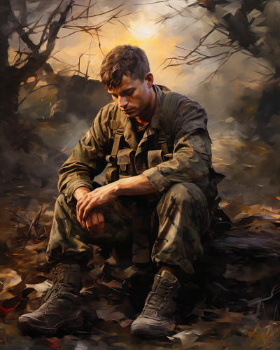 modernday soldier exahusted after battle, 8k, impressionism style, --ar 4:5