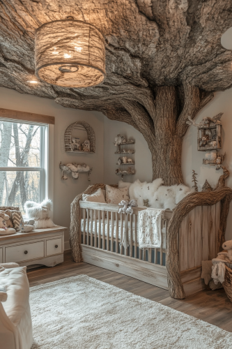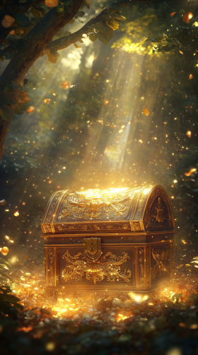 3D render of a mysterious, dense forest bathed in the soft light of dawn. The tall trees, with their thick trunks and intertwining branches, create a canopy that filters the morning sunlight, casting long shadows and illuminating patches of fog that hover close to the forest floor. The scene should evoke a sense of wonder and mystery, with subtle details like dew-covered leaves and distant sounds of nature --ar 7:4