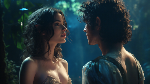 a musical scene on stage. the stage desing is a forest. there is a beautiful woman with brown hair. we see more skin of her. she is not an elf. she is singing to a elvish prince with dark curly hair --ar 16:9