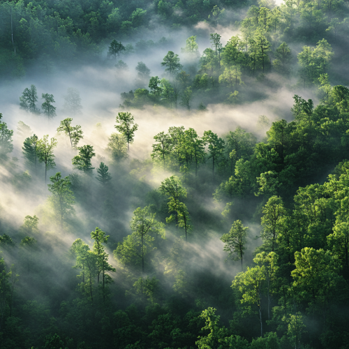 forest shrouded in mist. The soft, diffused light creates an ethereal atmosphere, highlighting the lush greenery of the treetops. The mist cascades through the trees, adding layers of depth to the composition and creating a sense of mystery. The clarity and detail achieved through the camera settings enhance the tranquil beauty of this enchanting forest scene Taken with a Canon R6 Mark II and RF 24-70mm lens set at f/8.3 and 1/200th --v 6.1
