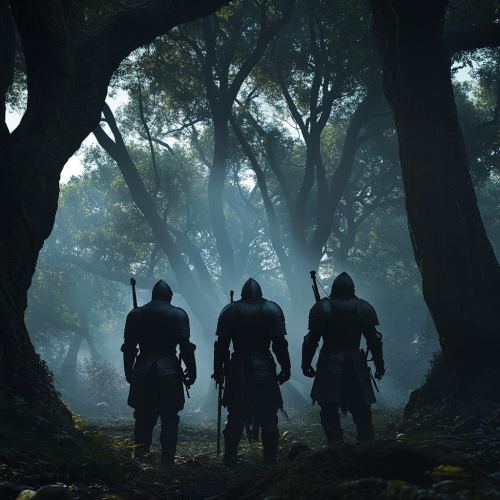 three men in plate armor stand small, silhouetted against a huge magical forest. The setting is medieval fantasy. The forest is gorgeous and highly detailed. Dynamic lighting, cinematic quality.