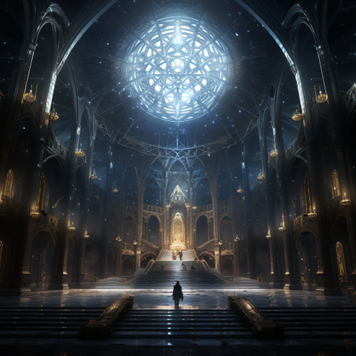 a massive cathedral interior, dark stone structure, infinity symbols and stars