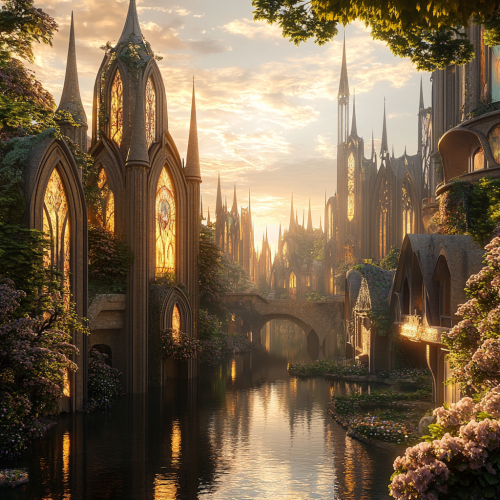 Realistic pictures of a garden inhabited by fairies, a bright emerald green forest with pastel flowers, rose arches, little fairies and light dust dancing in the air.