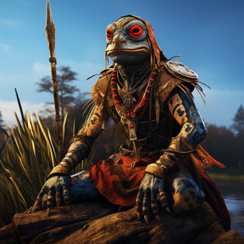 frog hunter full body, native american equipment, upgraded equipment, 1970's dark fantasy, digital art, masterpiece painting, ultra detailed, ultra high definition, 8K resolution, 3D shading, superior quality, cover illustration, complex design, rich vibrant colours, hyperrealistic, meticulously hyper detailed, high contrast, artstation ar 9:16