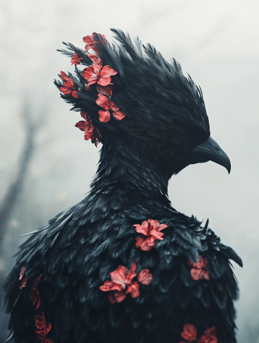Majestic giant bird creature, black feathers, glowing silver eyes.