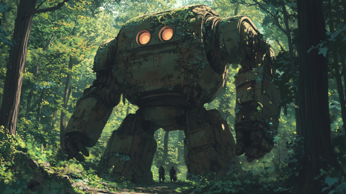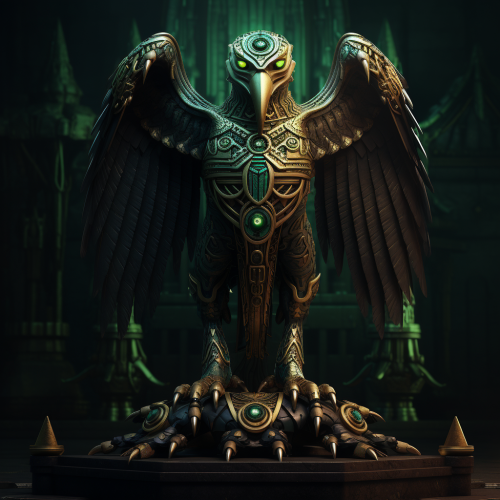 giant Egyptian bird statue. Some robotic features. Dark colors. Ominous green glowing eyes. Evil looking