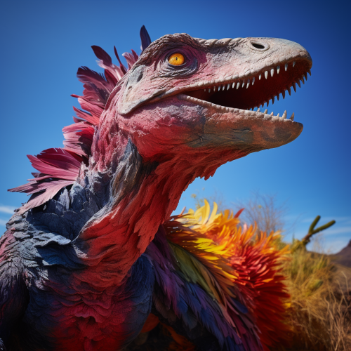 Tyrannosaurus rex as a giant bird with colorful feathers, National Geographic photography