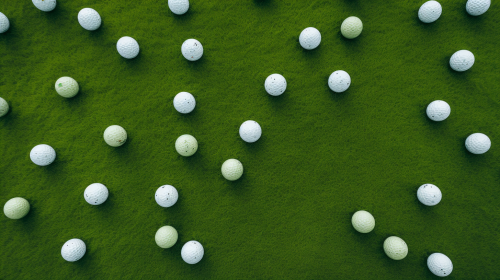 a flat turf surface with golf balls from a birds eye view --ar 16:9