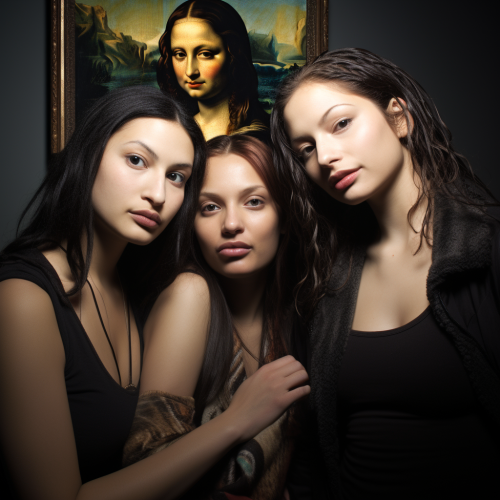 realiste,photo de 3 jeunes femmes heureuses qui s'amusent, dansent, boivent et profitent de la soirée en discothèque ,new york, 23 ans, celle du millieu porte un haut avec un dessin de mona lisa, modern.