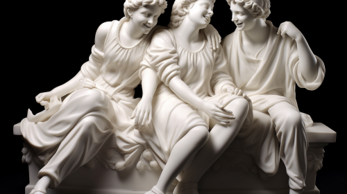 three Roman marble statues who are friends, smirking, dancing, female and male, white porcelain, happy, Michelangelo, photorealistic, highly detailed, 8k --ar 16:9 --no teeth