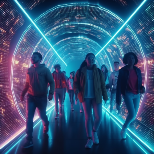 photorealistic, cinematic, ultra realistic 4K, HD, group of 25 years old boys and girls, very happy, running inside a metaverse tunnel, crypto coins a flying in the air, there are neon lights --s 750 --v 5.0