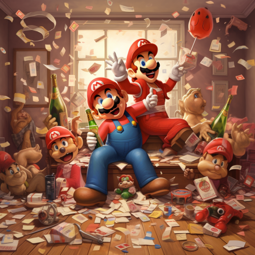 a happy new year postcard with crazy super mario partying with princess peach and a writing "Happy new Year"