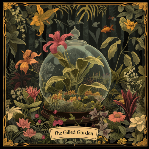 lithograph style advert for "The Gilded Garden" in the style of Art Nouveau featuring a terrarium. --v 6.0