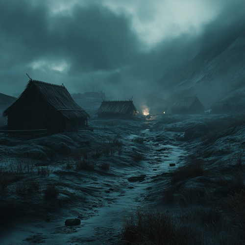 a dark fantasy tundra 3d environment that is cinematic and dark yet beautiful there are small huts in the back round as if inhabited by some pagan people