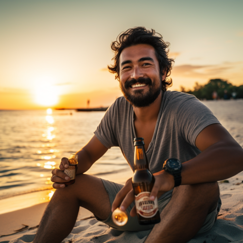 late 20s Asian man drinking a beer on the beach in the Maldives at sunset. He should be 3/4 from the camera, smiling, relaxed, carefree.