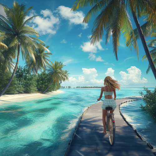 maldives, road, beautiful woman riding retro bicykle, ultra realistic,detailed, hd, photographic ,8k, ratio 16:9, panoramic view --v 6.0
