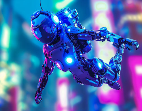 an anime cyberpunk blue and silver robot that can fly with a fusion jet pack on its back, in Quantum Fauvist style, vivid color, nightscape detailed background --v 6.0 --ar 9:7