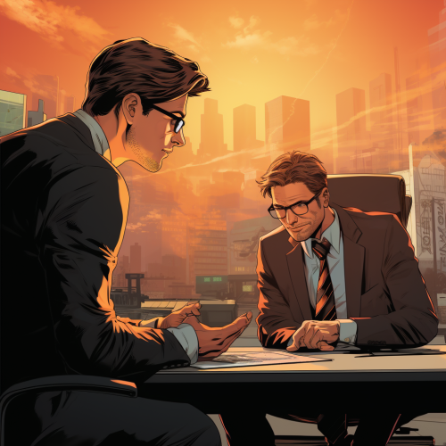 In the sunny office during the day, a 40-year-old male boss, Do not wear glasses,sitting behind a desk, a male employee holding a gift in his hand, giving it to the boss, they are very happy and smiling, and the photography is high-definition --ar 8:3 --v 6.1