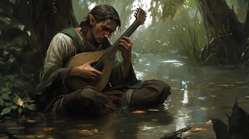male elf bard with lute, standing in swamp, dark skin, extremely confused, wearing simple clothes, long angular face, brown hair, middle aged elf, depressed, soggy, style of video game character, --ar 16:9