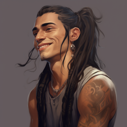 digital illustration portrait flat male elf long dark hair undercut shaved sides ponytail pointed ears jovial smile kind sleeveless tattoo sleeves niji