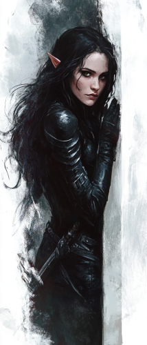A female elf rogue in black leather armor, holding a dagger, peering around a corner. Dark fantasy setting. Mood is eerie and ethereal. Smooth watercolor art style. Background is white watercolor around the edges. --ar 3:7