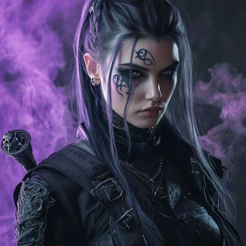 pale half elf woman in black robes and dark leather armor, black and silver hair, neck tattoos, wielding a black dagger, dark background with purple smoke, dark, mysterious, dungeons and dragons, forgotten realms