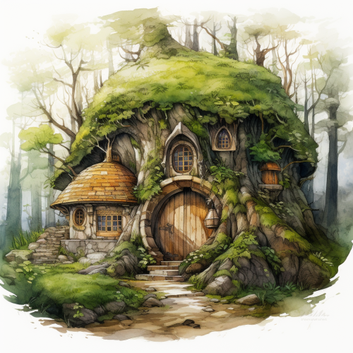 a crudely hand-drawn elven cabin in the forest in black and white ink