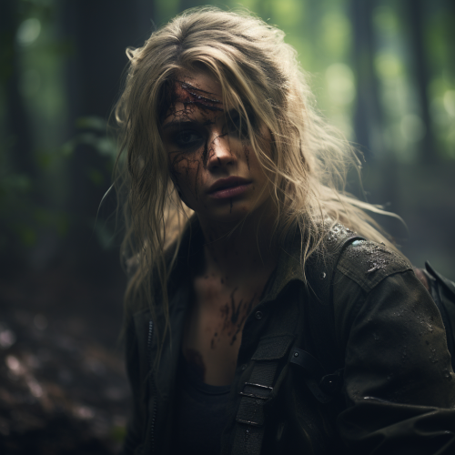 injured blonde woman ranger in the forest, dark fantasy aesthetic, high detail, hyperrealistic.