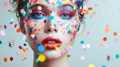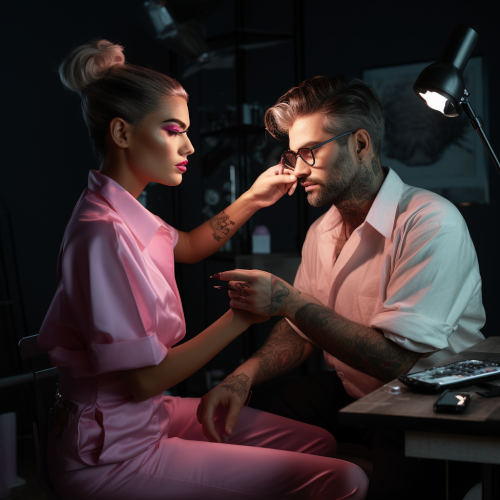 a depiction of a professional makeup artist working on his client in a well-lit photography studio - low-fi aesthetic, commercial, cool lighting scheme