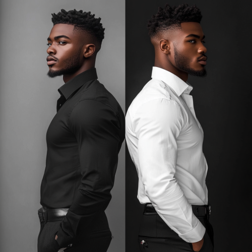 African male model with gel hair standing in two different looks back to back - in one of the looks he is in office wear with formal shirt against a day background and the other one is a party look with high fashion clothes with slight bling for night out against a night background