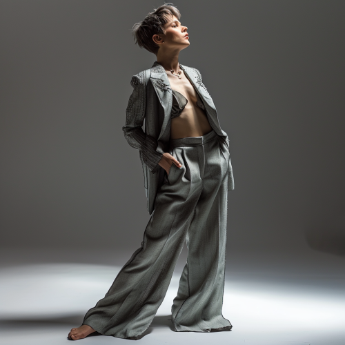 photoshoot, light studio, female model, short hair, gray suit, full body, wide pants, realistic photo, crystals on the jacket --v 6.0