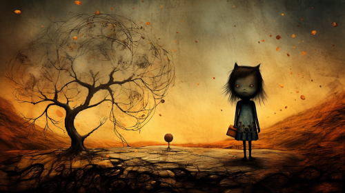 Close-up of a adorable cute kid girl standing infront of a tree in the bill traylor style, by Alexander Jansson, sky in the style of van gogh, Andy Kehoe, Mysterious, Japanese whimscal folk. --v 5.2 --ar 16:9