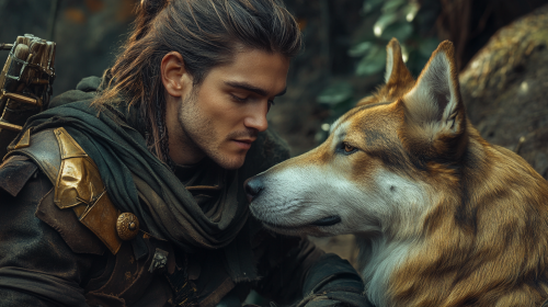 male ranger, dark fantasy, outdoors, epic, with a random animal companion, action shot, full body image, 4k, vivid, 4k ultra detailed, 4k cinematic, 4k hyper detailed, 4k ultra realistic, 4k hyper realistic, 4k photorealistic, --ar 16:9 --v 6.1
