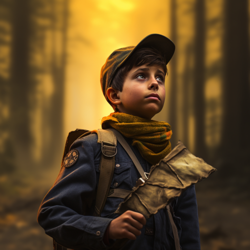 general shot of a boyscout boy with a boyscout cap and scarf on his neck, looks at a compass, is in the middle of a forest road, surrounded by yellowish haze, dystopia, cinematic, realistic