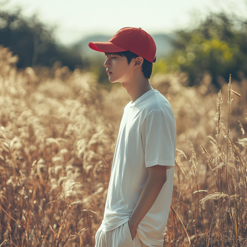 realistic photography, korean male model standing back, wearing a white t-shirt and fancy pants, wearing red baseball cap, grass on background but blurred, close up model, no face, the background is super blurred, sunny day