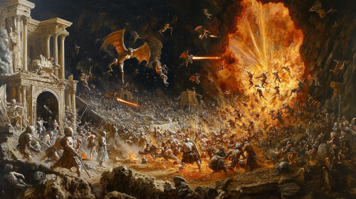 A painting in the style of James C. Christensen depicting an oil-painted scene of the chaos and grandeur of a fae battle in hell in a giant fiery cavern between mythical creatures, knights, hoplites, barbarians, and templars, ancient ruins, ancient structures made from bones, stone walls, brick buildings, iron sculptures, in the style of John Martin, humans made of magma coming out of the fire, red eyes, and psychedelic colors and a wizard fire sun rays, the scene is absolute chaos, extra details --ar 16:9 --v 6.1