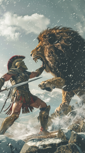 the most alpha male spartan warrior fighting a gigantic lion in a mountanous environment. it is snowing full HD --ar 9:16
