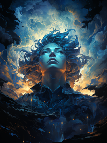 sorcerous sonorous squall, depiction of blue lightning magecraft, award-winning psychedelic illustration, heavily detailed patterns, double exposure, accents shaped like mana sparks, chaos, intricate, dark --ar 3:4 --stylize 1000 --style raw