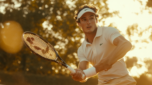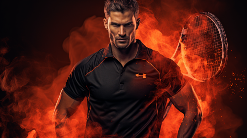 a photorealistic picture of a male tennis player dressed in black with an orange and red backround. The picture looks hot and firey and is shot from a distance so you can see his whole upper body --ar 16:9