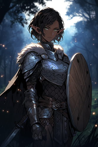 Anime style, wood elf shield-maiden, 25 years old, short black hair in a bob, large pointed ears, yellow eyes, dark skin, large scare running across his face, wearing plate armour, large pauldrons and fur pelt cloak over chainmail, standing on a battlefield at night, lit by moonlight --ar 2:3 --niji 5