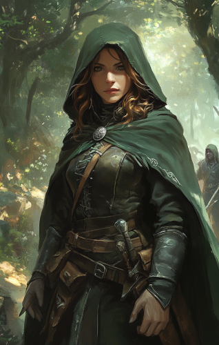 male wood elf rogue looking stealthy and mysterious wearing a black cape and a hood, holding a daguer in the hand and walking slowly towards the the viewer