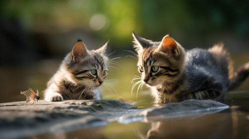 Two kittens by the tranquil riverbank; one engrossed in fishing, the other enchanted by a vibrant dragonfly hovering nearby. The fishing kitten's focused determination contrasts with the whimsical allure of the dragonfly. Photography, shot with a 50mm lens at f/2.8, capturing the serenity of the scene, --ar 16:9 --v 5.0