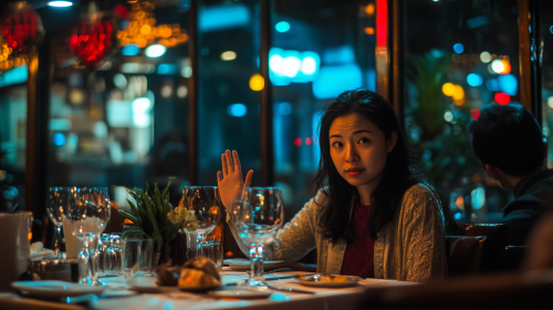 an asian women emotionless customer trying to wave their hand to get notice from the waiter who is too busy doing other things. restaurant atmostphere appear to be low light. shooting with leica. --ar 16:9 --v 6.1