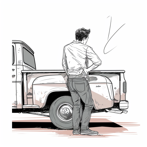 funny new yorker style cartoon of man holding the back of his pants and trying to hide his back against a pickup truck, minimalist line art --v 6.0