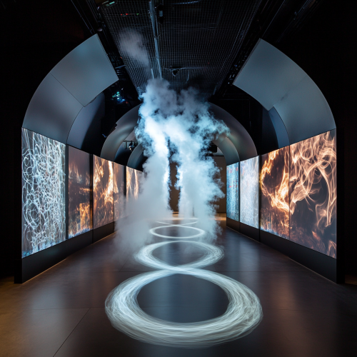 curved tunnel and walkway through the centre with video wall on either side in a museum. smoke rings emerge from the floor in front of the screens and patterns are shown on the screens behind them as they rise
