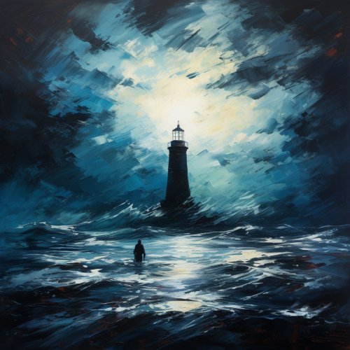 A5 size, rough and windy seascape with a black silhouette of a man on a boat created by the glossy light of a lighthouse that he is staring at. The colors are light and not too contrast, the atmosphere is super dreamy